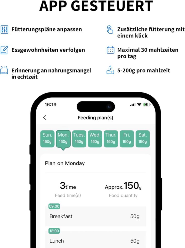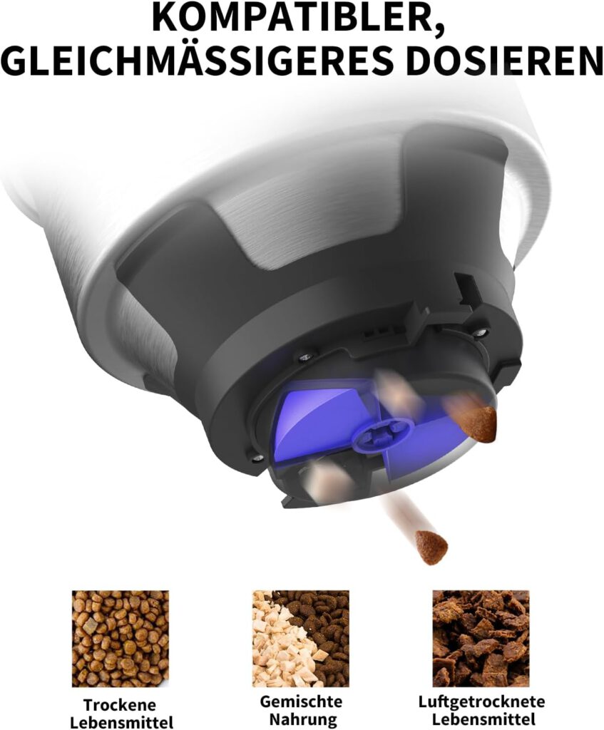 Programmierbare Portionskontrolle: Du kannst die Portionen von 5 bis 200 g pro Mahlzeit einstellen, damit dein Haustier genau die richtige Menge bekommt.